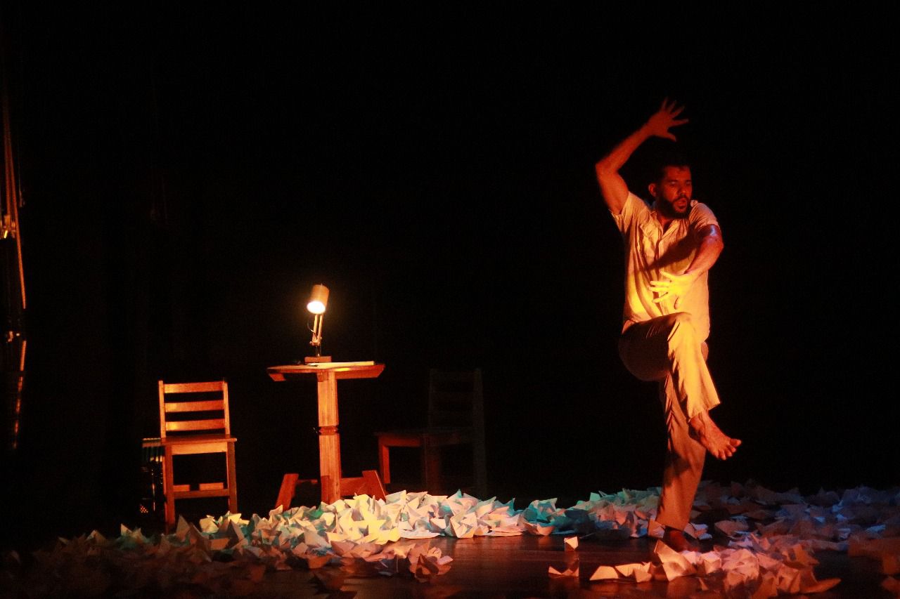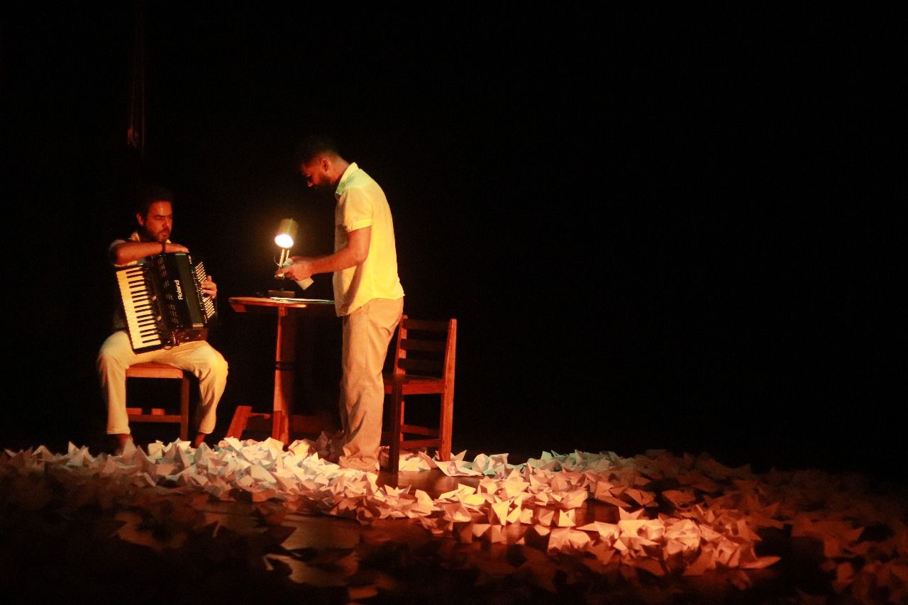 O palco do Dulcina está tomado de barquinhos de papel branco. São muitos mil. Tanto que a iluminação é transformada por eles: a caixa cênica de veludo preto absorve a luz, ao passo que o chão, com esse mar de barcos, reflete a luz dos refletores, proporcionando um clarão de baixo para cima no corpo do performer. Os barquinhos são feitos, necessariamente, de maneira artesanal e esse trabalho manual dialoga tanto com os gestos das mãos e dedos de Ednei, quanto com as mãos do acordeonista Matheus Queiroz.