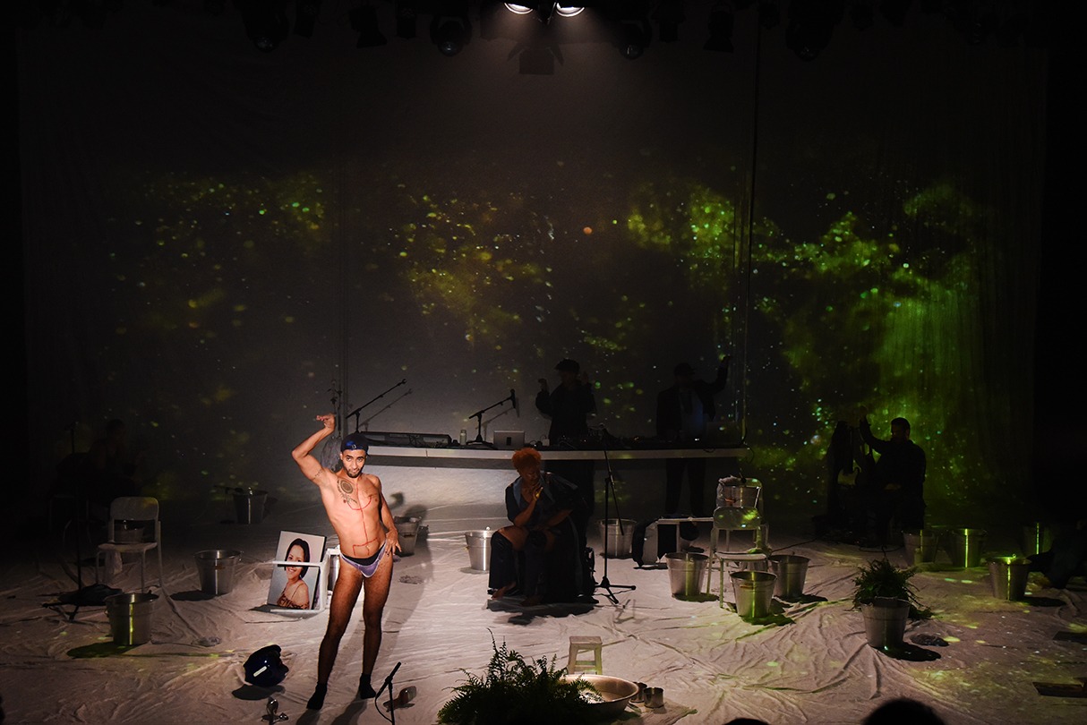 Um espaço de “tradução” a mais é o telão, onde os corpos virtuais de Adeleke Adisaogun Ajiyobiojo, Aretha Sadick e Zahy Guajajara dançam em escala expandida diante dos corpos de carne, osso e sangue dos performers.