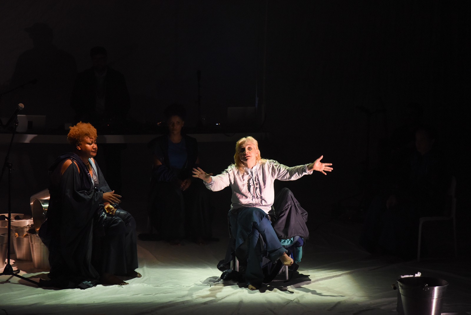 Um outro recurso que emerge nesses corpos se encontra na relação da fala e a escuta e, aqui, chamo de “tradução”. Enquanto Luaa gesticula, Dani supõe o que passa na cabeça de uma atriz branca contrariada e começa um jorro de palavra, na relação com um jorro gestual da parceira de cena. Estrela D’alva, por sua vez, ouve a voz de Nêgo Bispo e, ao longo de sua fala, o corpo da performer mistura tanto gestos mais tradicionais da dança (favorecidos por seu corpo longilíneo), quanto um gestual mais duro, que a tradição europeia consideraria “menos belo”. Ali está uma dança-luta entre a colonização e os corpos coletivos afro-diaspóricos.