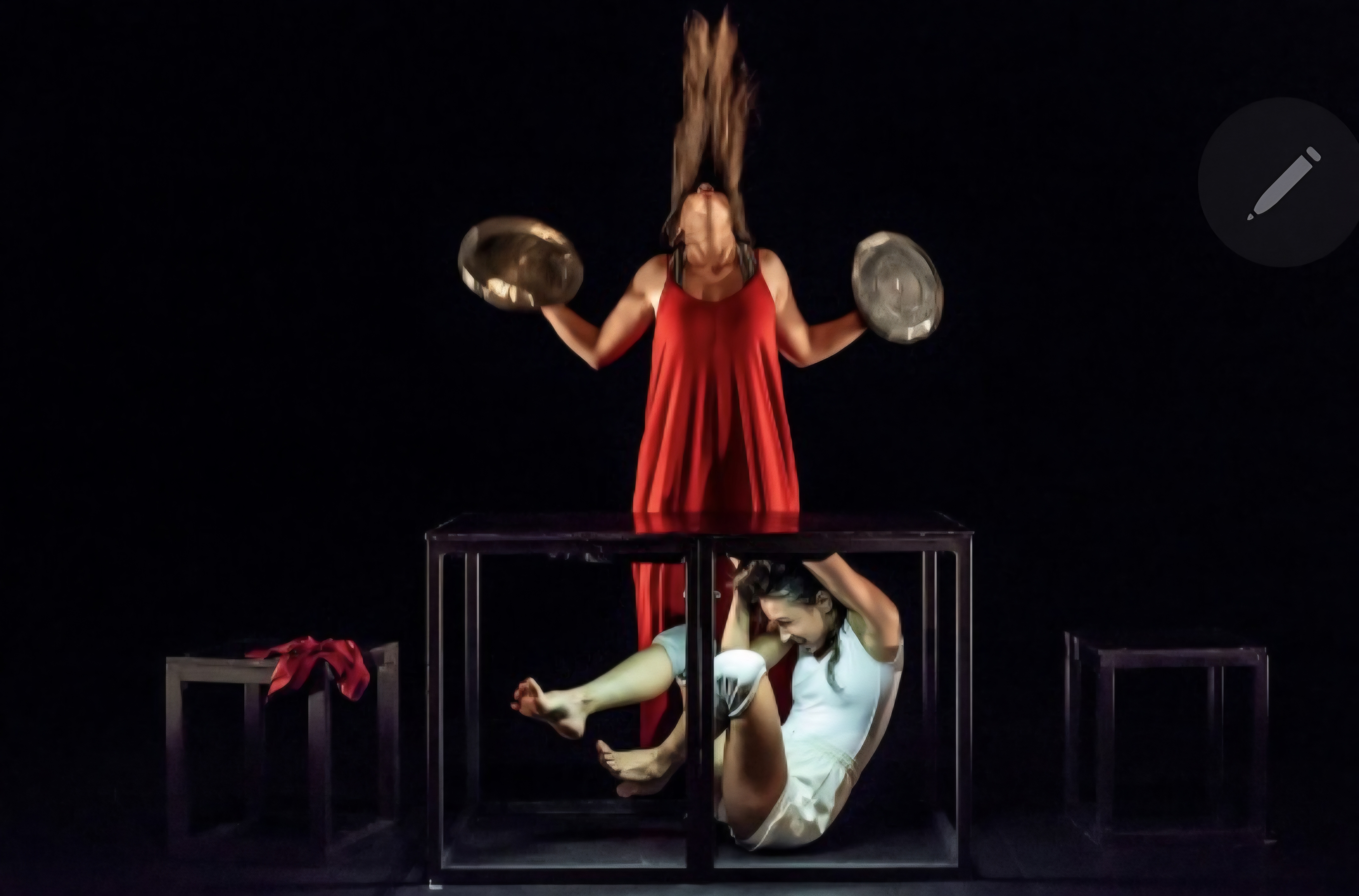 Nessa cena inicial, em que Naira Carneiro está coberta pela membrana transparente, seu corpo, contorcido no chão, vai ganhando movimentos sutis, enquanto a membrana plástica vai ganhando ar e se tornando uma esfera inflada. Esse corpo retorcido sobre si vai ser explorado nessa primeira parte do espetáculo no plano baixo, preferencialmente. Isso cria um contraponto visual com a presença de Tainá Baldez, prioritariamente em pé.