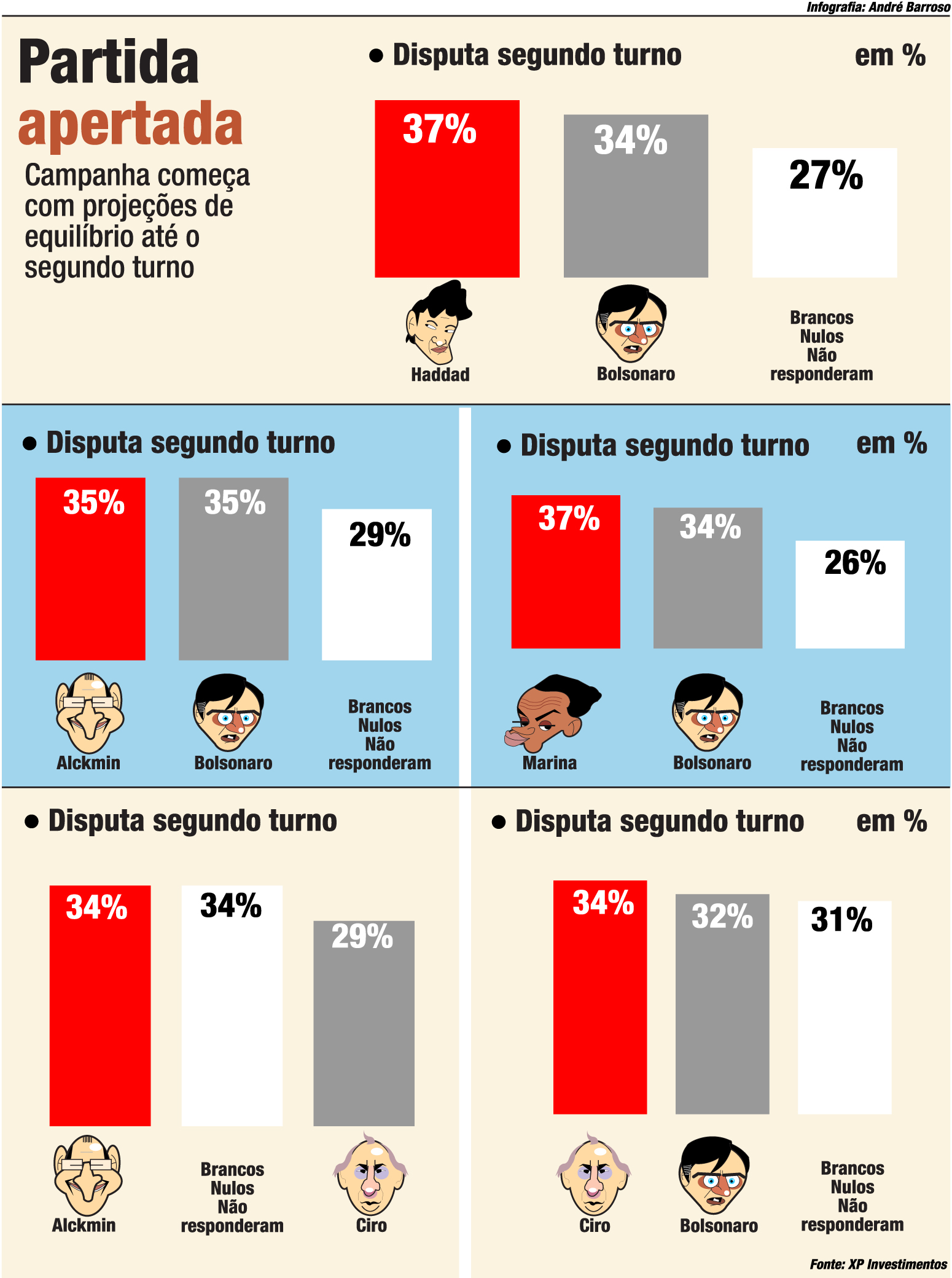 Com Lula, preso há cinco meses e condenado na segunda instância, fora do páreo, cenário mais provável, Bolsonaro abre sua maior vantagem, de dez pontos percentuais, sobre o segundo colocado. Ou colocada, para ser exato, Marina Silva, da Rede Sustentabilidade, com 13%. Antes de desafiar diretamente o ex-capitão, Alckmin terá que deixar o empate técnico ante Marina, Ciro Gomes, do PDT (9%), Fernando Haddad, do PT (6%) e mesmo, no limite da margem de erro (3,2 pontos percentuais para cima ou para baixo), com Álvaro Dias, do Podemos (4%) e João Amoêdo, do Novo (4%).