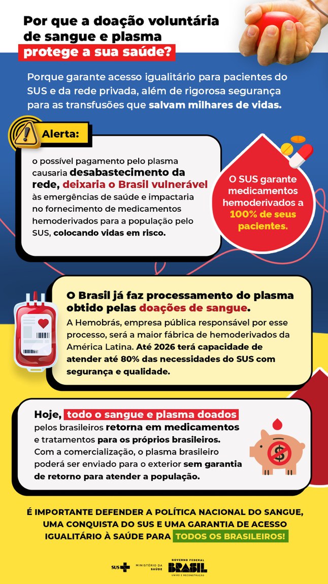 “Se a gente desestimular a doação de sangue porque o sangue virou um comércio, pode faltar sangue até para transfusão, além de faltar o plasma para a Hemobrás processar, em assistência aos hemofílicos. Poderia faltar sangue na ponta, como quando você entra na emergência do hospital”, acrescenta.