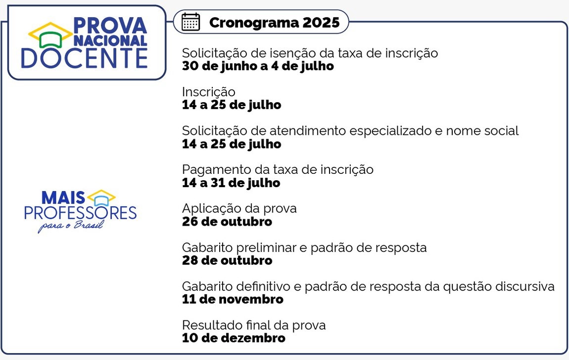 O Ministério da Educação (MEC), por meio do Instituto Nacional de Estudos e Pesquisas Educacionais Anísio Teixeira (Inep), publicou, nesta terça-feira, 17 de junho, o Edital nº 72/2025, que trata das diretrizes, dos procedimentos e dos prazos para participação na Prova Nacional Docente (PND). O período de inscrição começa em 14 de julho, exclusivamente pelo Sistema da PND, e vai até o dia 25 do mesmo mês. A prova será aplicada pelo Inep em todos os estados e no Distrito Federal no dia 26 de outubro.