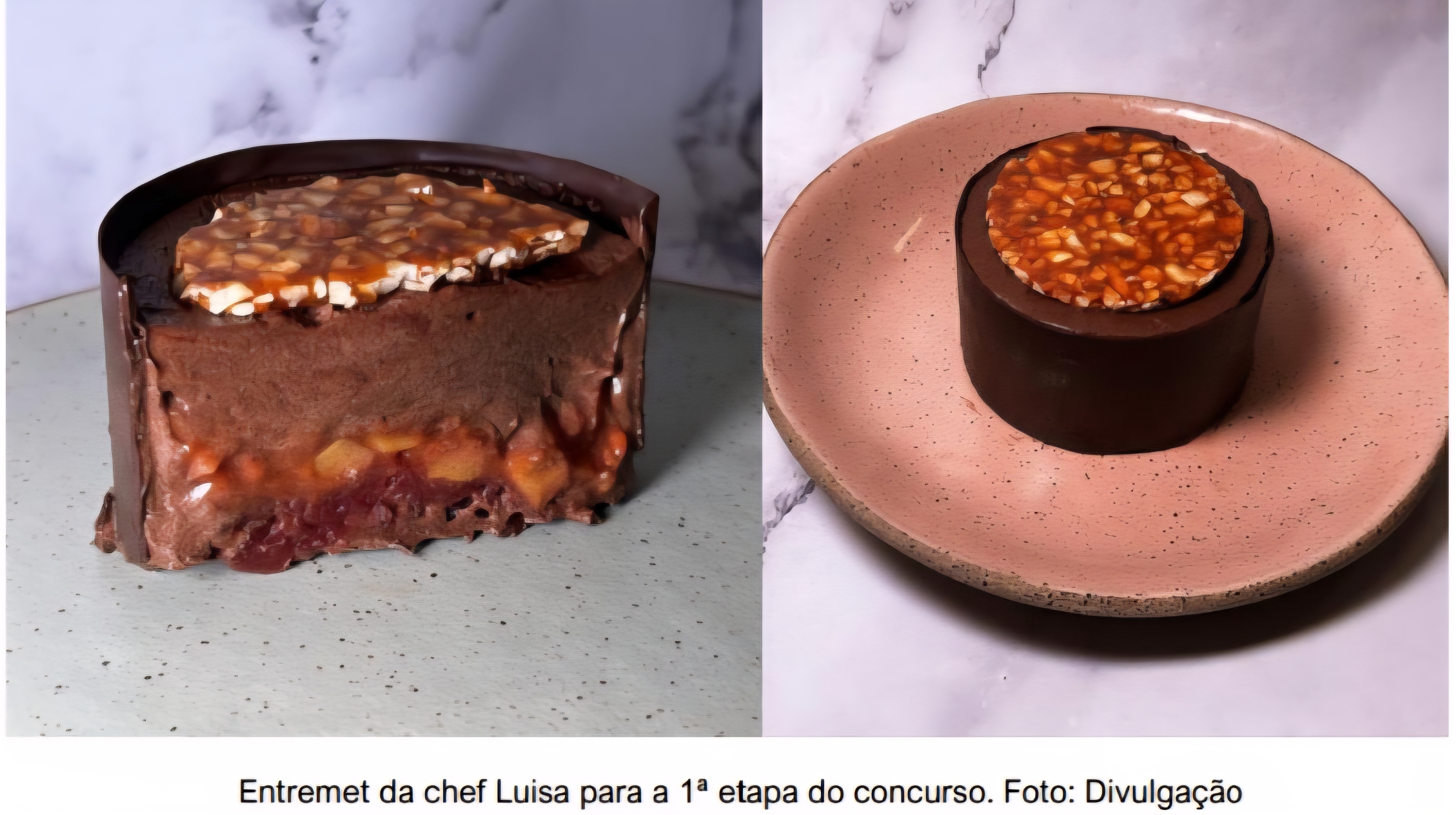 Para a primeira etapa, que foi realizada online, a chef criou um entremet composto por mousse de chocolate com cumaru, compota de goiaba, gel de hibisco, uma cinta de chocolate temperado e, para finalizar, um crocante de castanha de caju.