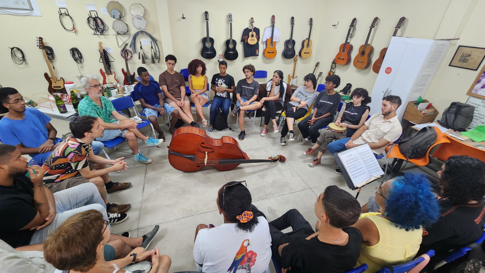 “A ideia surgiu quando visitei o Jacarezinho, a convite do Antônio Carlos Costa, presidente da ONG Rio de Paz. Havia muitos problemas, crianças e jovens nas ruas sem ter o que fazer. Mas percebemos também possibilidades incríveis, uma força cultural muito potente”, lembra Bruno Aguilar, fundador e professor de baixo do projeto, orgulhoso ao contar que a escola já impactou diretamente mais de 500 pessoas: “Nosso objetivo nunca foi somente formar músicos, mas sim mostrar que a música é um instrumento de transformação, forma de despertar uma sensibilidade diferente para ver o mundo”.