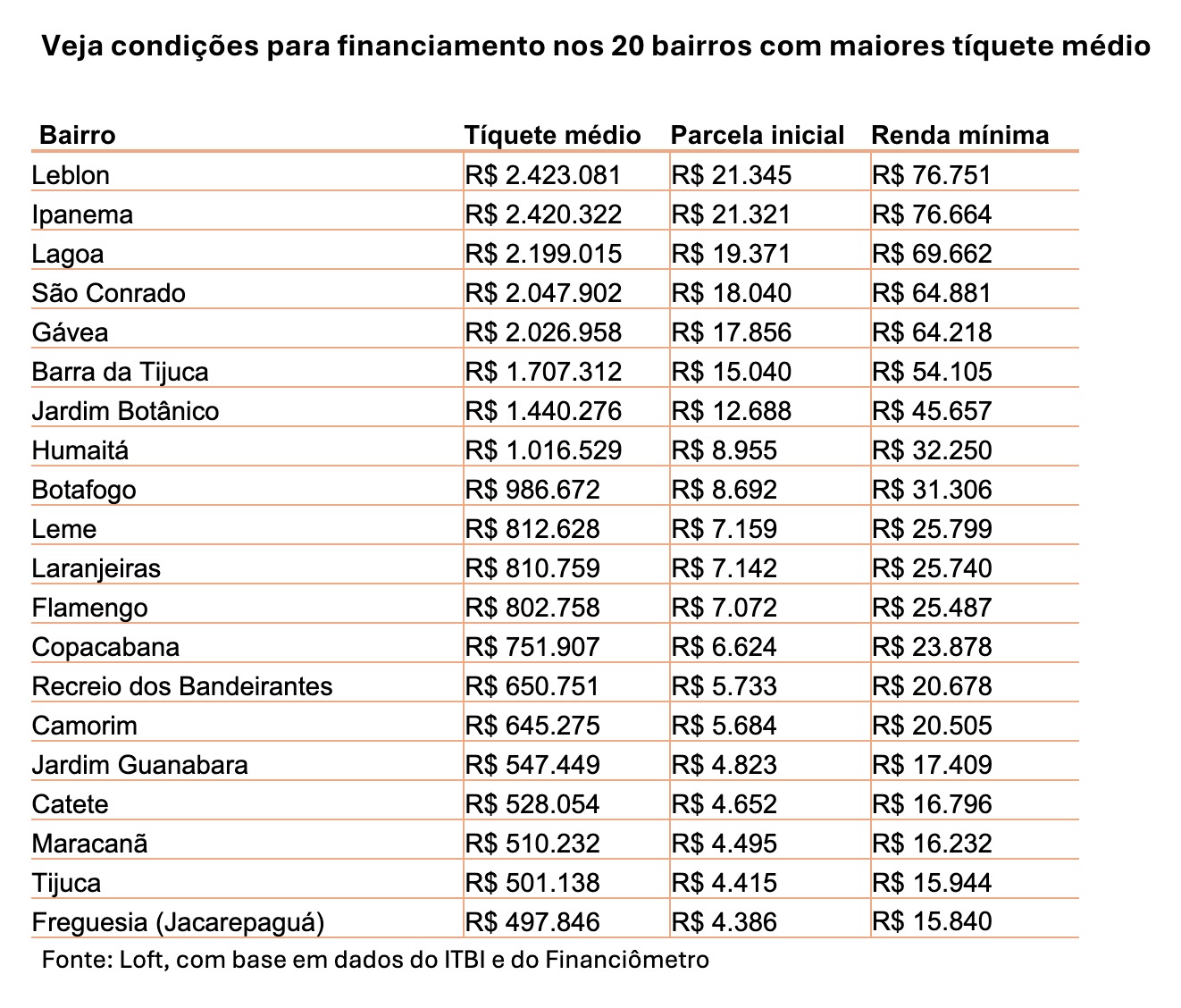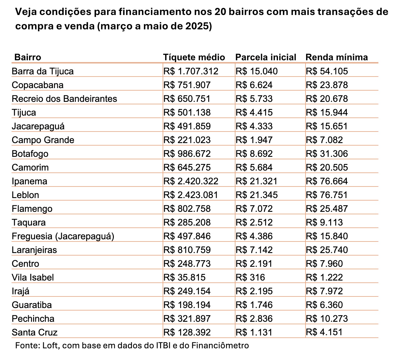 Nos bairros com maior volume de transações, como Barra da Tijuca, Copacabana e Recreio dos Bandeirantes, a renda mensal exigida para aprovação do crédito vai de R$ 20 mil a R$ 54 mil, em média.