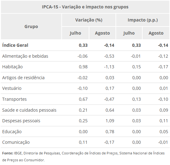 A variação e o impacto negativo mais intensos vieram do grupo Habitação (-1,13% e -0,17 p.p.), devido à queda na energia elétrica residencial (-4,93%), subitem que exerceu o impacto mais intenso no índice (-0,20 p.p.). Também registraram quedas em agosto Alimentação e bebidas (-0,53% e -0,12 p.p.) e Transportes (-0,47% e -0,10 p.p.), grupos de maior peso no IPCA-15 juntamente com Habitação.