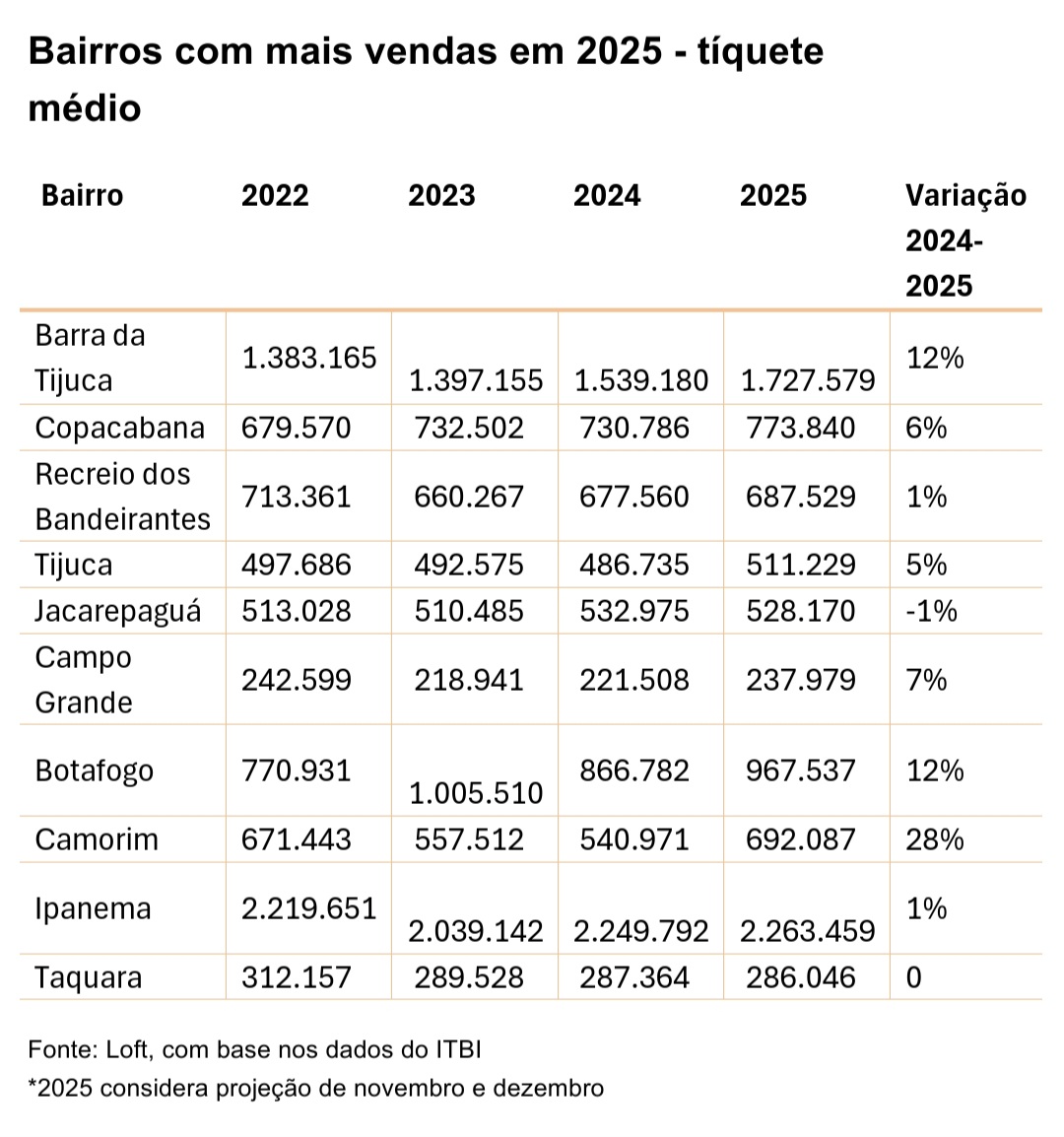 A análise do tíquete médio — indicador do valor dos imóveis comercializados — mostra comportamentos distintos entre os bairros que mais venderam. Camorim apresentou a maior valorização entre as regiões com mais transações, com crescimento de 28%, seguido pela Barra da Tijuca e Botafogo, ambas com alta de 12%.