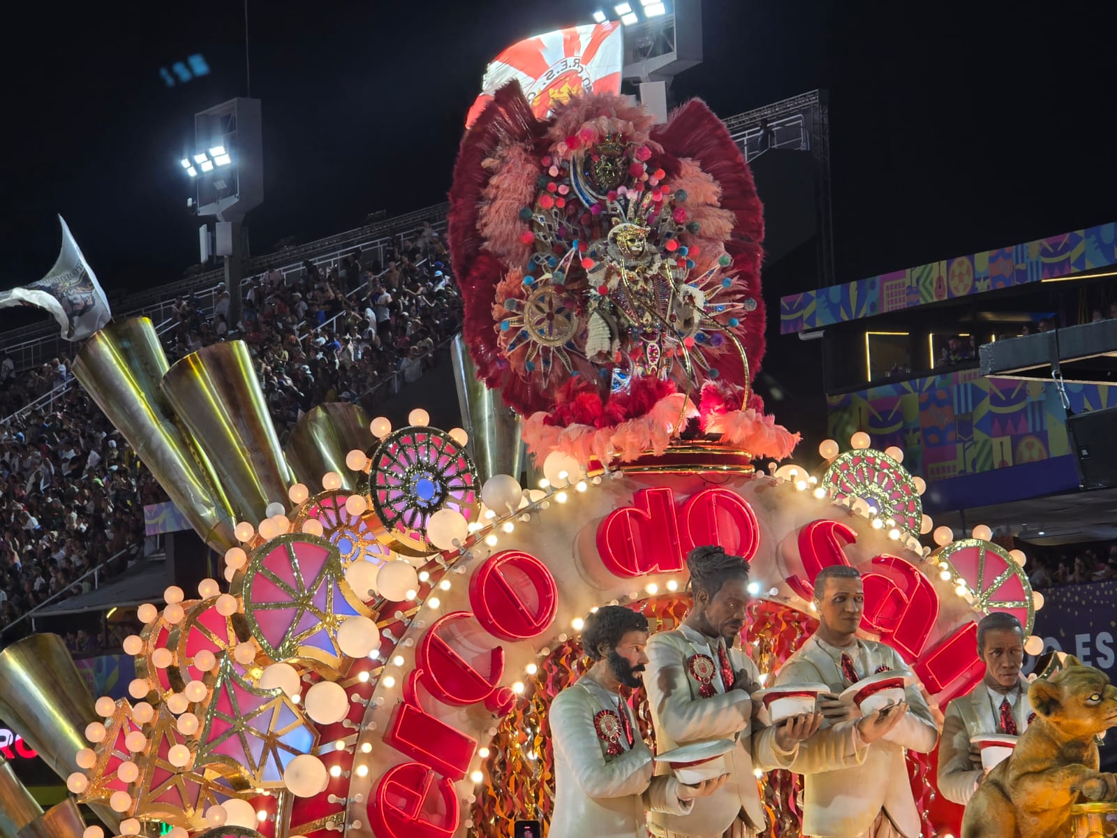 Outro destaque que chamou a atenção foi o leão que rugia alto no abre-alas. A alegoria, de 15 metros, simbolizava a Estácio de Sá. Ao lado do veículo, telas de LCD exibiram figuras marcantes do samba, entre elas Dominguinhos do Estácio e Luiz Melodia.