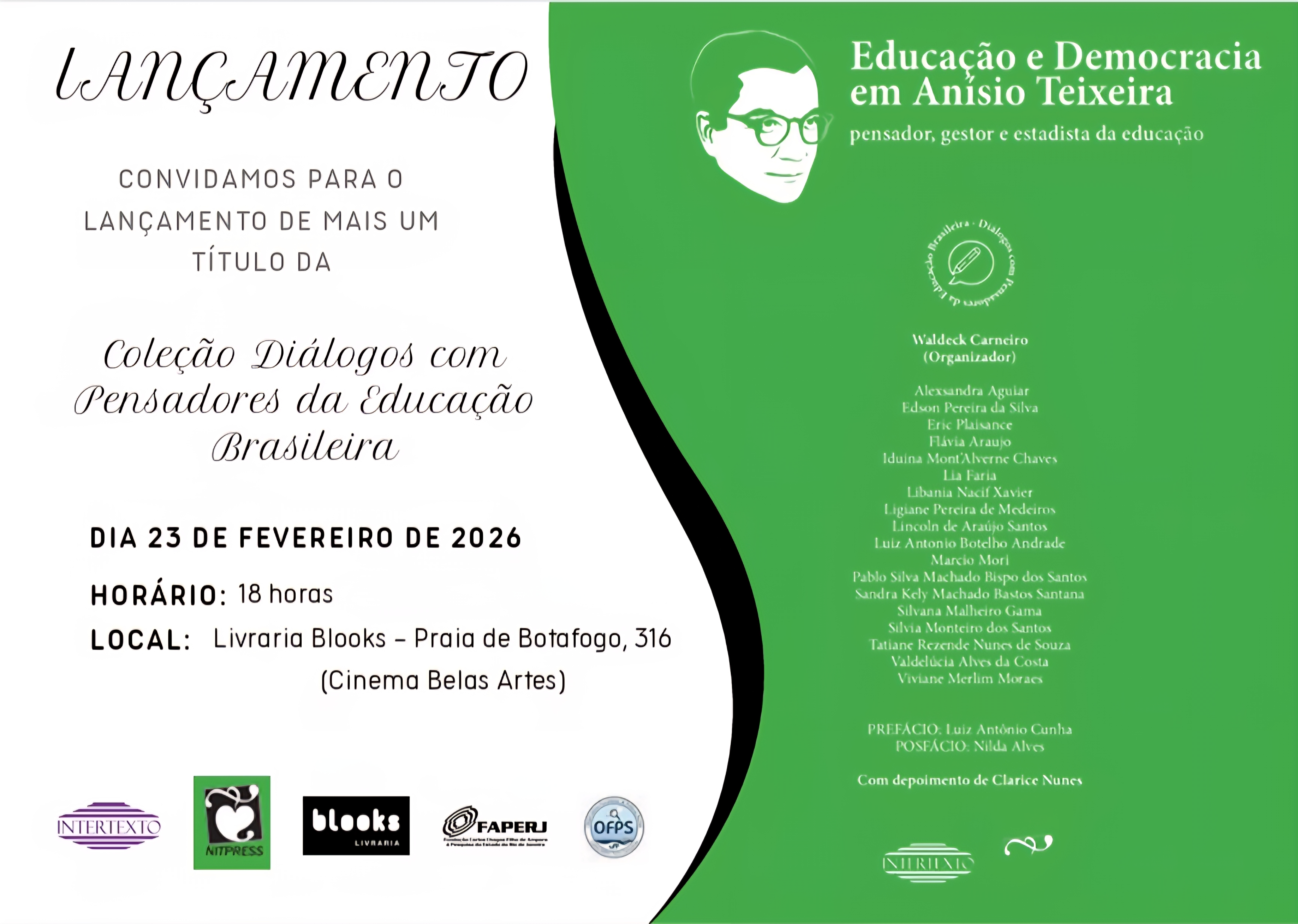 Com organização do professor titular da Universidade Federal Fluminense (UFF), coordenador-geral do Fórum Estadual de Educação do RJ (FEE/RJ) e presidente do Fórum Nacional de Gestão Democrática da Educação (FORGEDE), Waldeck Carneiro, será lançado nesta segunda-feira (23/02), às 18h, na Livraria Blooks, em Botafogo, mais um título da Coleção “Diálogos com Pensadores da Educação Brasileira”. O homenageado da vez é o gestor, professor e estadista da educação Anísio Teixeira com a obra “Educação e Democracia em Anísio Teixeira”, com dezoito autores, prefácio do sociólogo e filósofo Luiz Antônio Cunha, pósfácio da professora titular da UERJ e da UFF Nilda Alves e com depoimento de Clarice Nunes, Doutora em Ciências Humanas, dedicada à História da Educação.